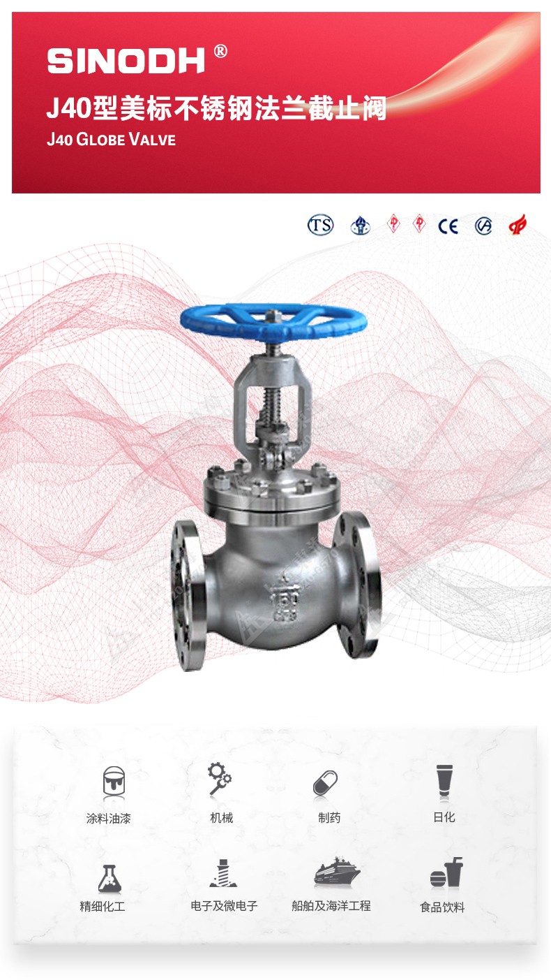 J40型美标不锈钢截止阀,为MK在线登录官网自主研发生产。本产品的设计制造符合美国国家标准ANSIB16.34,美国石油学会标准AP1 6D和AP I 600要求,产品结构紧凑密、刚性好、封性性能优秀是一种最常见的启闭阀,利用闸板的上下工作来接通(全开)和截断(全关)管道中的流体介质。