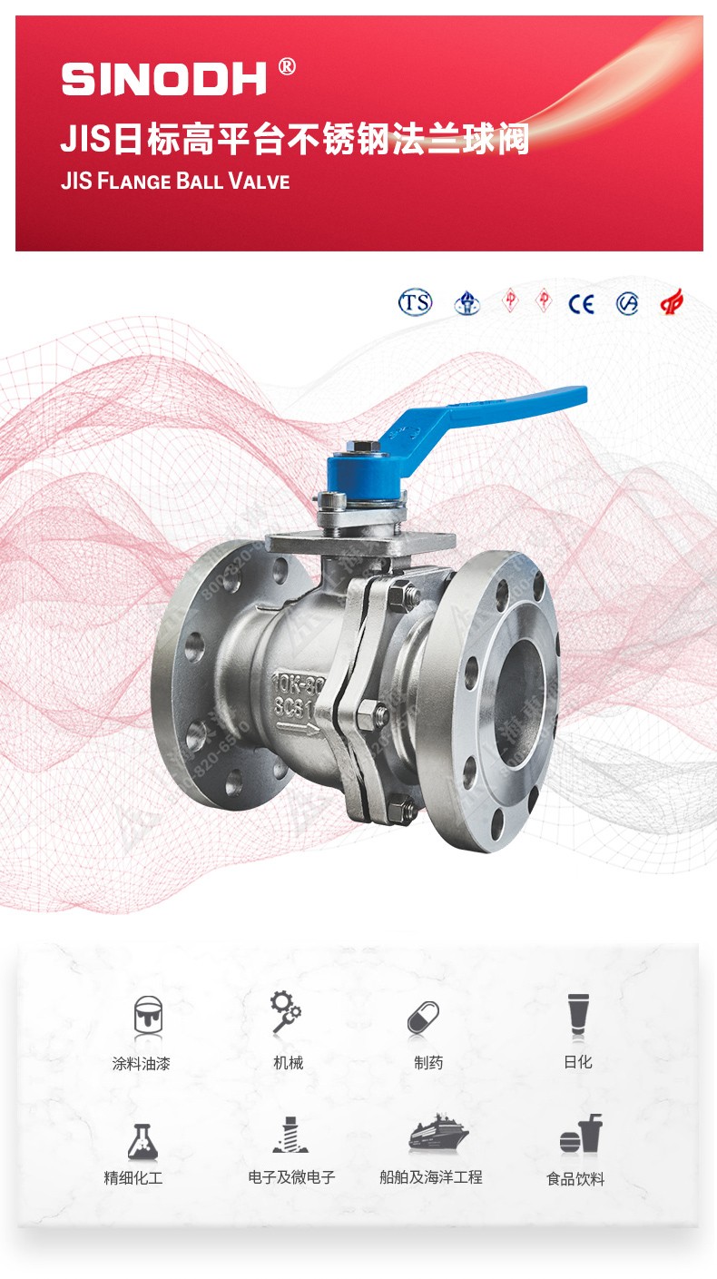 JIS日标高平台不锈钢法兰球阀,为MK在线登录官网自主研发生产本产品设计制造标准符合J1 SB2071标准,该产品的球体(密封件)是浮动的,在介质压力作用下,球体能产生-定的位移并紧压在出口端的密封面上,保证出口端密封。适用于水、溶剂、酸和天然气等一般工业介质,也适用于工况恶劣的介质,如氧气、过氧化氢、乙烯等介质。